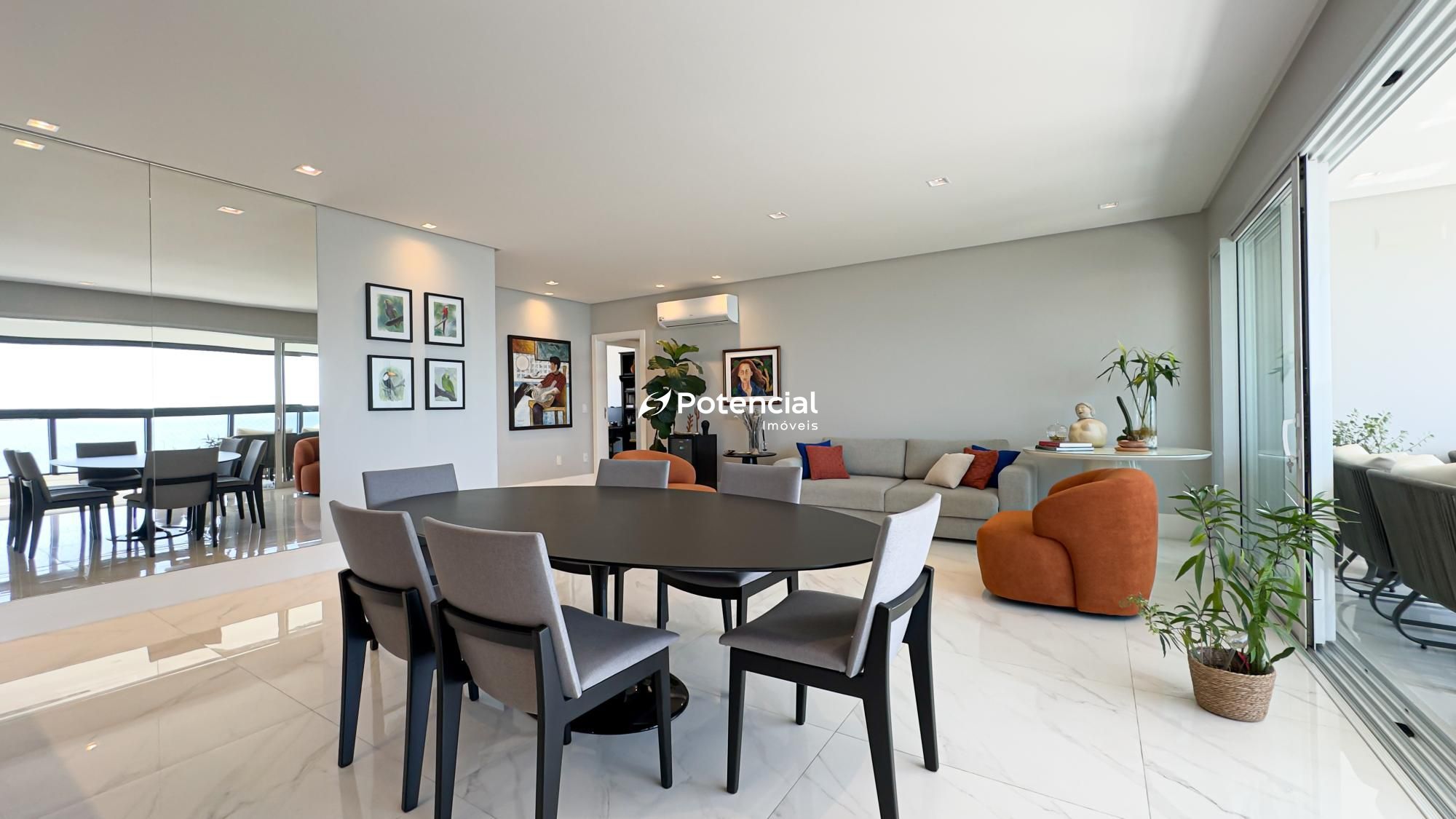 O amplo living integra perfeitamente a sala de estar e a sala de jantar, criando um ambiente elegante e acolhedor, ideal para receber familiares e amigos. A área social se conecta a uma ampla sacada com churrasqueira, onde é possível desfrutar de momentos especiais com uma belíssima vista para o mar.
